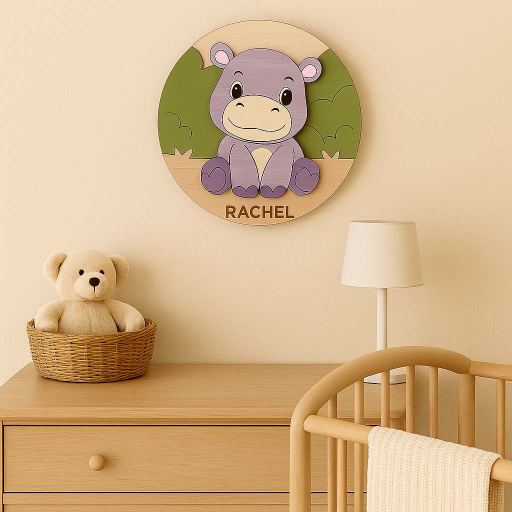 Hipopotamul Jucaus - Decoratiune Camera prinde viata prin culori calde si detalii atent lucrate – un semn decorativ realizat din placaj de lemn stratificat, pictat manual si personalizat la cerere. Perfect pentru perete sau usa camerei micutului visator.