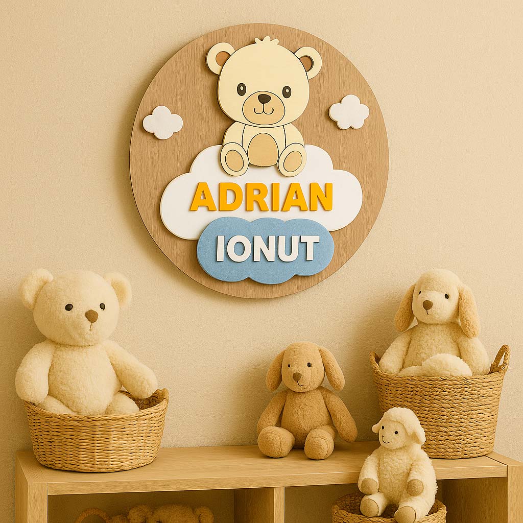 Ursuletul Visator - Decoratiune Camera prinde viata prin culori calde si detalii atent lucrate – un semn decorativ realizat din placaj de lemn stratificat, pictat manual si personalizat la cerere. Perfect pentru perete sau usa camerei micutului visator.