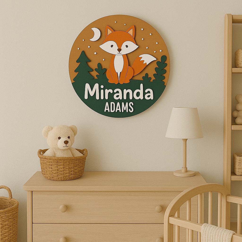Vulpita sub Stele - Decoratiune Camera prinde viata prin culori calde si detalii atent lucrate – un semn decorativ realizat din placaj de lemn stratificat, pictat manual si personalizat la cerere. Perfect pentru perete sau usa camerei micutului visator.